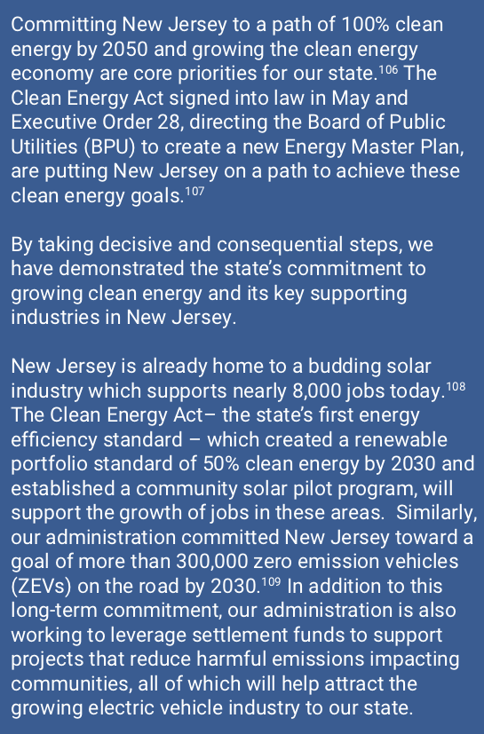 New Jersey’s new “economic development master plan” is embedded in a report issued by the NJ Economic Development Authority titled “The State of Innovation: Building a Stronger and Fairer New Jersey.” First accounts of the report, such as this one from NJBIZ, mentioned a focus on wage growth, on community college education, on innovation, and on streamlining regulations for small business, but did not specifically mention that clean energy is a major part of the “innovation” focus.
